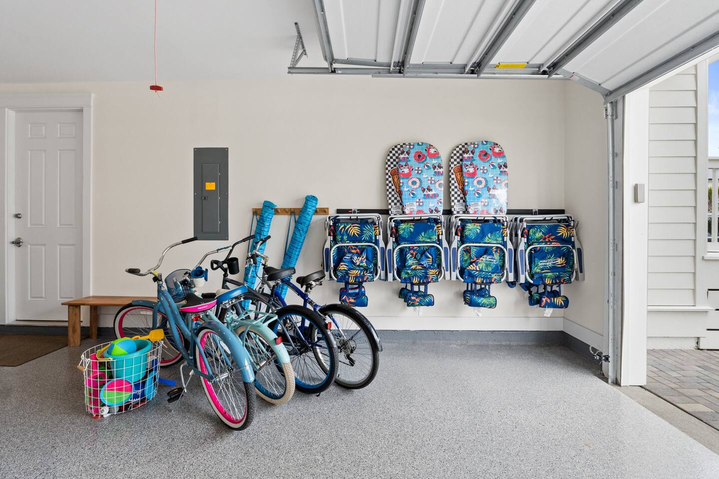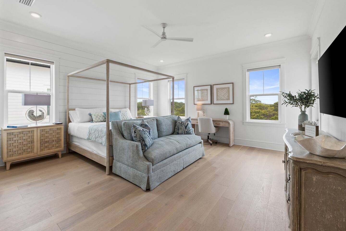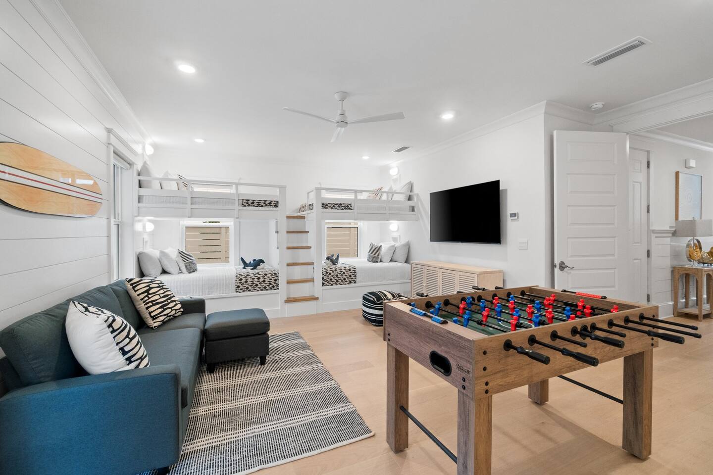 The sand may brush off, the salt may wash away, but the memories will last forever! Welcome to Sea SALT & SunLIGHT ☀ 4,200 sq ft of stylish living space ☀ 6 Spacious and exquisitely decorated bedrooms; 5 kings, 2 full over full bunks (with lights and charging stations). Every bedroom has a large flatscreen smart TV and darkening shades over the windows. ☀ 6 bathrooms: 5 ensuites, and 1 full bathroom directly adjacent to bedroom. ☀ Large open-concept kitchen w/ modern finishes, gas range, Aqua Pro water filter for great tasting water, beautiful large island plus 6 stools for hanging out while in the kitchen. ☀ 4 Balconies: one screened balcony with an extendable table for outdoor dining or games on the patio and a chaise sofa for relaxing and taking in the magnificent 30A sunsets from our west facing porch. ☀ Elevator to help with getting up and down the stairs with luggage and groceries. ☀ 3 minute golf cart ride, 6 minute bike ride, 11 minute walk to the beach. ☀ Golf cart/LSV - brand new 6-seater with bluetooth speakers and upgraded leather seats. ☀ Secret reading nook hideaway off of the bunk room. ☀ Built-in outdoor grill station on large covered patio with yard that faces a gorgeous and serene nature preserve that backs up to Draper Lake. Includes ping pong table and cornhole. ☀ Kid’s amenities: Pack ‘n’ Play, highchair, plates/bowls/cups. ☀ Beach chairs, umbrellas, assorted sand toys & Boogie Boards!! ☀ Arcade game, foosball, PS4 game console and games, board and card games. ☀ Outdoor shower with hot water for rinsing off after a day at the beach. ☀ Great location: short golf cart, bike or walk to beach, restaurants, and the best ice cream on 30A at Blue Mountain Creamery. ☀ Parking: Plenty of parking available between the garage, driveways, and community parking lot. EXTRAS! We have got you covered with everything you need to make your vacation seamless: - a starter kit for essentials: paper towels, toilet paper, linens, towels, dish soap, laundry pods, etc. - All bathrooms come fully equipped with body wash, shampoo, and conditioner - Keurig and coffee maker with starter complimentary coffee. - Separate Aqua Pro water filter at the kitchen sink for great tasting filtered water. - Beach towels, umbrellas and beach chairs - Brand new 6-seater golf cart, with bluetooth speakers and upgraded brown leather seats. - 4 complimentary bikes and 2 small razor scooters (for younger ones) give you the ability to cruise around! Options are endless – you can take The Timpoochee Trail all the way down 30A, to the beach, restaurants or to nearby nature trails and parks. - Laundry room with washer and dryer. - Nightlights in the hallways that double as emergency flashlights. - Ring doorbell and external garage camera and sensor light. THE BEDROOMS The Master Suite on 3rd Floor - King size Pottery Barn canopy bed with luxury Leeza Legacy mattress - 65" Amazon Fire smart TV - private balcony for magnificent sunsets, and coffee or a good book in the mornings. - ensuite bathroom with large walk-in shower with dual shower heads including a rain head with great water pressure - separate water closet - walk-in closet Guest Suite 1 on 3rd Floor - King size bed - 55” Amazon Fire smart TV - ensuite with a shower and bathtub combination Guest Suite 2 on 3rd Floor - King size bed - 55” Amazon Fire smart TV - ensuite with a shower and bathtub combination Guest Suite 1 on 2nd Floor - King size bed - 55” Amazon Fire smart TV - ensuite with a shower and bathtub combination Guest Suite 2 on 2nd Floor - King size bed - 55” Amazon Fire smart TV - adjacent full bath with a shower and bathtub combination - private patio The Bunk Room on 1st floor - 2 sets of built-in bunkbeds featuring full beds - ensuite bathroom with walk-in shower - 65" Amazon Fire smart TV, NBA Jam arcade, PS4 and games, foosball, board games - secret hideaway reading nook with books - access to back porch with built-in grill, dining table, and ping pong table