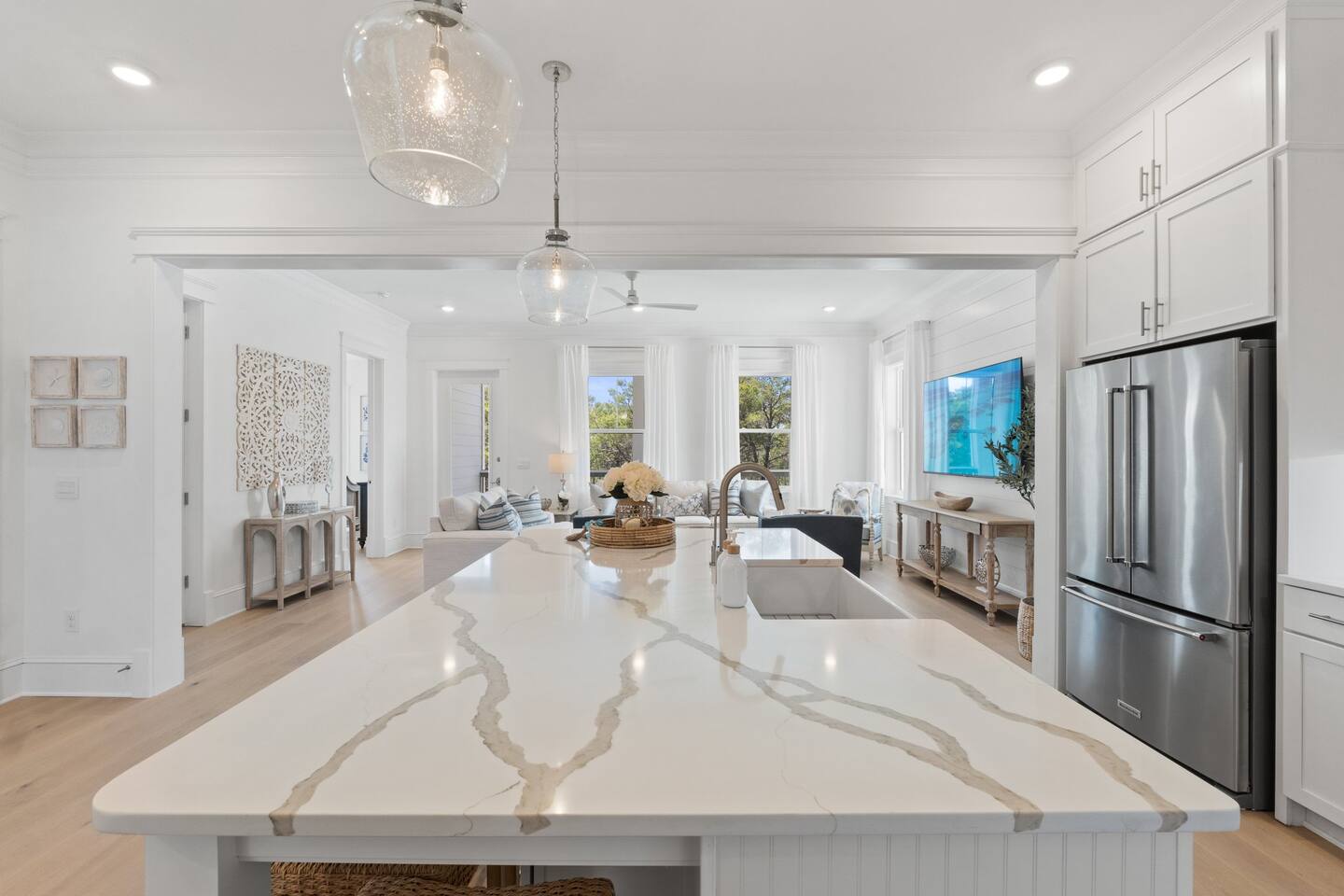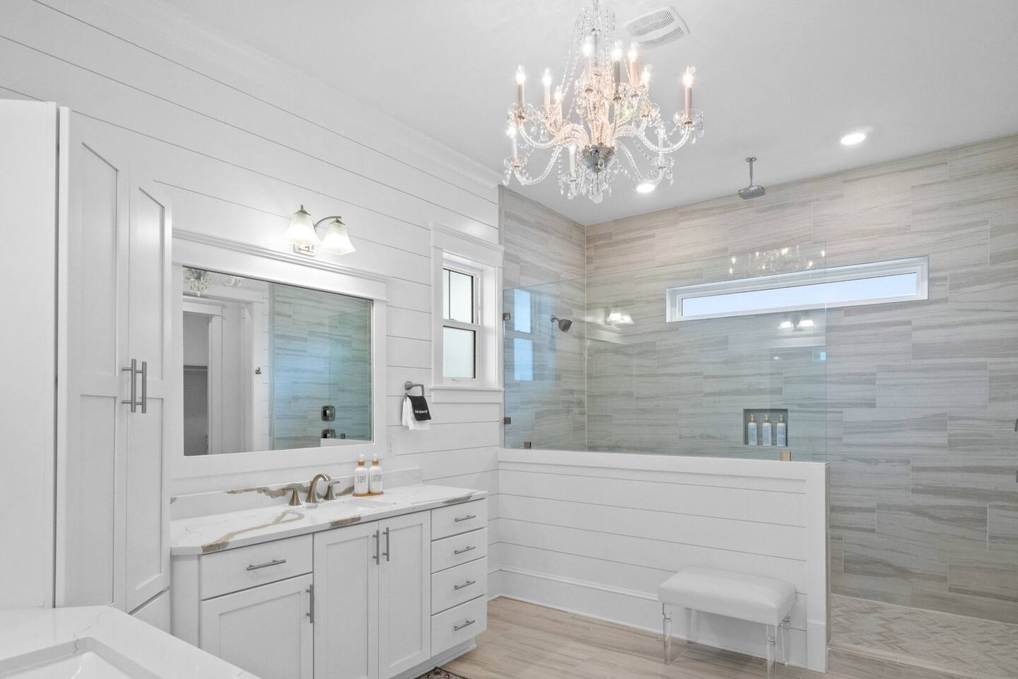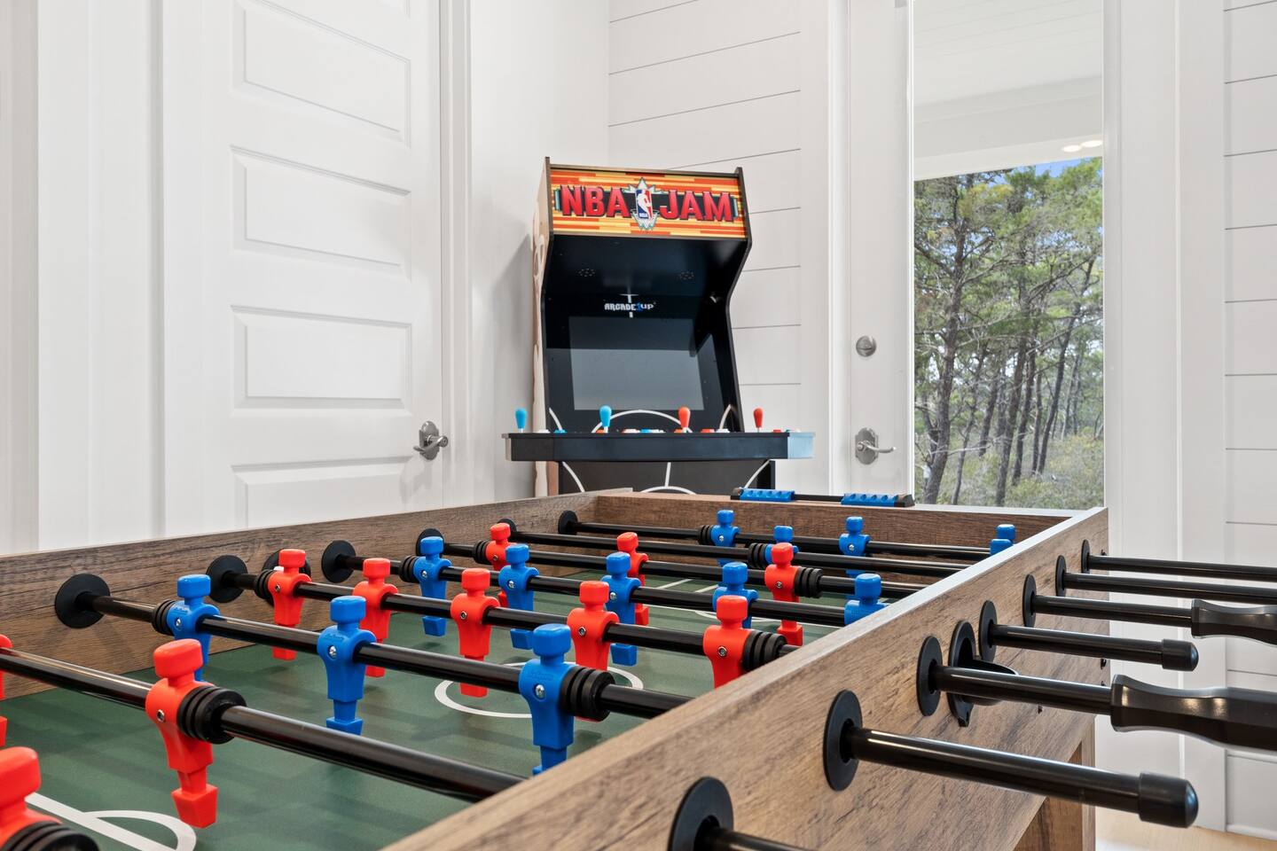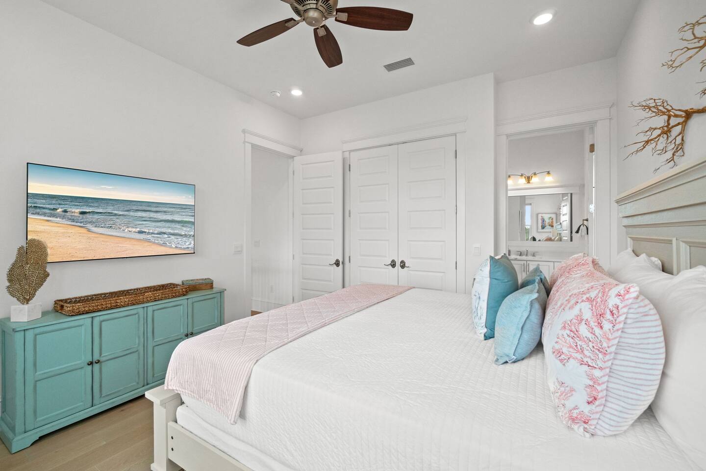 The sand may brush off, the salt may wash away, but the memories will last forever! Welcome to Sea SALT & SunLIGHT ☀ 4,200 sq ft of stylish living space ☀ 6 Spacious and exquisitely decorated bedrooms; 5 kings, 2 full over full bunks (with lights and charging stations). Every bedroom has a large flatscreen smart TV and darkening shades over the windows. ☀ 6 bathrooms: 5 ensuites, and 1 full bathroom directly adjacent to bedroom. ☀ Large open-concept kitchen w/ modern finishes, gas range, Aqua Pro water filter for great tasting water, beautiful large island plus 6 stools for hanging out while in the kitchen. ☀ 4 Balconies: one screened balcony with an extendable table for outdoor dining or games on the patio and a chaise sofa for relaxing and taking in the magnificent 30A sunsets from our west facing porch. ☀ Elevator to help with getting up and down the stairs with luggage and groceries. ☀ 3 minute golf cart ride, 6 minute bike ride, 11 minute walk to the beach. ☀ Golf cart/LSV - brand new 6-seater with bluetooth speakers and upgraded leather seats. ☀ Secret reading nook hideaway off of the bunk room. ☀ Built-in outdoor grill station on large covered patio with yard that faces a gorgeous and serene nature preserve that backs up to Draper Lake. Includes ping pong table and cornhole. ☀ Kid’s amenities: Pack ‘n’ Play, highchair, plates/bowls/cups. ☀ Beach chairs, umbrellas, assorted sand toys & Boogie Boards!! ☀ Arcade game, foosball, PS4 game console and games, board and card games. ☀ Outdoor shower with hot water for rinsing off after a day at the beach. ☀ Great location: short golf cart, bike or walk to beach, restaurants, and the best ice cream on 30A at Blue Mountain Creamery. ☀ Parking: Plenty of parking available between the garage, driveways, and community parking lot. EXTRAS! We have got you covered with everything you need to make your vacation seamless: - a starter kit for essentials: paper towels, toilet paper, linens, towels, dish soap, laundry pods, etc. - All bathrooms come fully equipped with body wash, shampoo, and conditioner - Keurig and coffee maker with starter complimentary coffee. - Separate Aqua Pro water filter at the kitchen sink for great tasting filtered water. - Beach towels, umbrellas and beach chairs - Brand new 6-seater golf cart, with bluetooth speakers and upgraded brown leather seats. - 4 complimentary bikes and 2 small razor scooters (for younger ones) give you the ability to cruise around! Options are endless – you can take The Timpoochee Trail all the way down 30A, to the beach, restaurants or to nearby nature trails and parks. - Laundry room with washer and dryer. - Nightlights in the hallways that double as emergency flashlights. - Ring doorbell and external garage camera and sensor light. THE BEDROOMS The Master Suite on 3rd Floor - King size Pottery Barn canopy bed with luxury Leeza Legacy mattress - 65" Amazon Fire smart TV - private balcony for magnificent sunsets, and coffee or a good book in the mornings. - ensuite bathroom with large walk-in shower with dual shower heads including a rain head with great water pressure - separate water closet - walk-in closet Guest Suite 1 on 3rd Floor - King size bed - 55” Amazon Fire smart TV - ensuite with a shower and bathtub combination Guest Suite 2 on 3rd Floor - King size bed - 55” Amazon Fire smart TV - ensuite with a shower and bathtub combination Guest Suite 1 on 2nd Floor - King size bed - 55” Amazon Fire smart TV - ensuite with a shower and bathtub combination Guest Suite 2 on 2nd Floor - King size bed - 55” Amazon Fire smart TV - adjacent full bath with a shower and bathtub combination - private patio The Bunk Room on 1st floor - 2 sets of built-in bunkbeds featuring full beds - ensuite bathroom with walk-in shower - 65" Amazon Fire smart TV, NBA Jam arcade, PS4 and games, foosball, board games - secret hideaway reading nook with books - access to back porch with built-in grill, dining table, and ping pong table